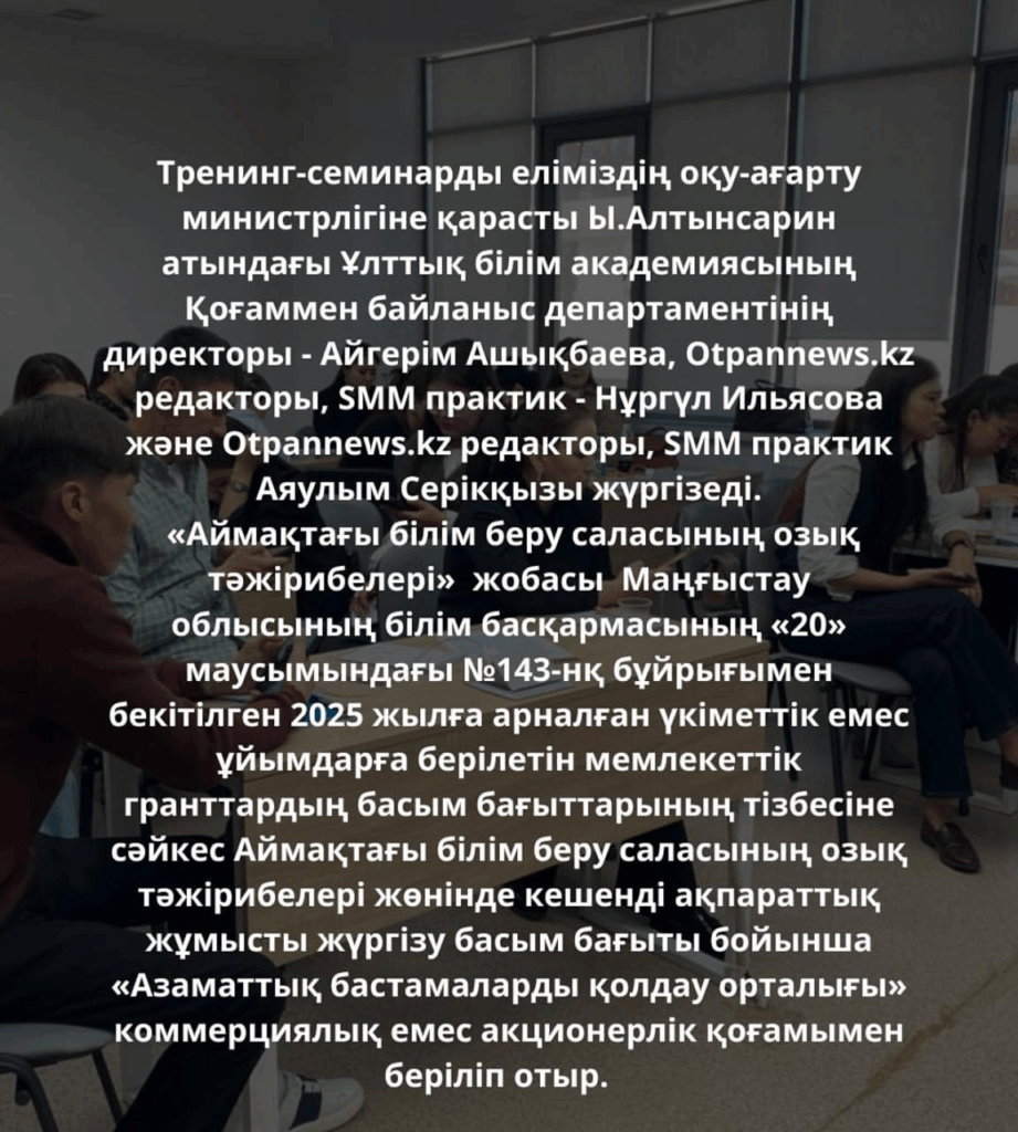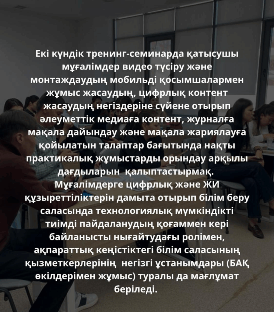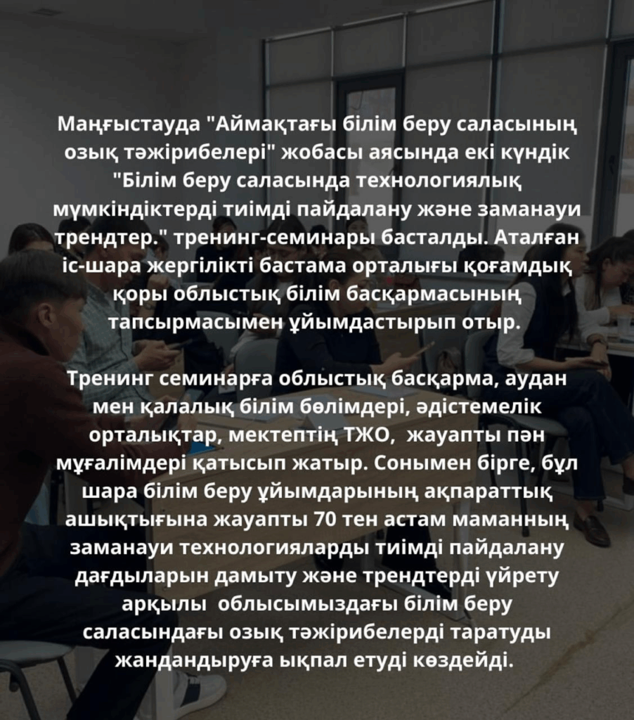 Маңғыстауда білім беру саласында заманауи технологияларды қолдануға арналған семинар басталды.Қазан 14, 2025Маңғыстауда білім беру саласында заманауи технологияларды қолдануға арналған семинар басталды. Leave a Reply Cancel replyYour email address will not be published. Required fields are marked *Name * Email * Website Comment * Save my name, email, and website in this browser for the next time I comment.
